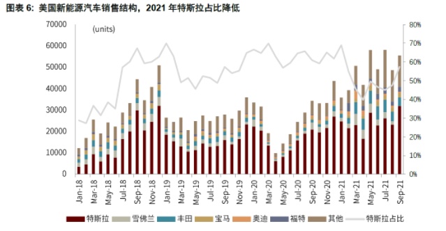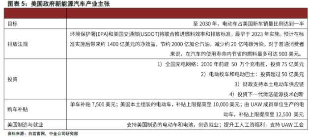 政策端,本届美国政府上任来持续推动新能源汽车行业刺激政策的出台,并于8月签署行政命令,设定2030年电动车占新车销量比例达到50%的国家战略目标。正式法案则正在制定中,或于近期递交美国国会投票,包括上限达到12,500美元的税收抵免,有望对新能源汽车消费形成强刺激;以及投资75亿美元于2030年前建设50万个公共充电桩,补足基础设施短板。
