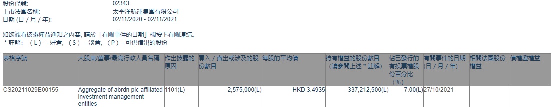 智通财经APP获悉,香港联交所最新资料显示,10月27日,Aggregate of abrdn plc affiliated investment management entities增持太平洋航运(02343)257.5万股,每股作价3.4935港元,总金额约为899.58万港元。增持后最新持股数目约为3.37亿股,最新持股比例为7.00%。
