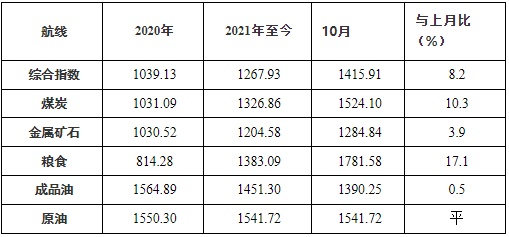 10月,政策发力,煤价下跌,在煤炭资源依旧偏紧的大背景下,下游抓紧补库,运输需求释放,带动其它货种市场运价一起上涨,沿海散货运输市场运价呈上行趋势。10月29日,上海航运交易所发布的沿海(散货)综合运价指数报收1435.10点,较上月同期上涨15.3%,月平均值为1415.91点,较上月上涨8.2%。