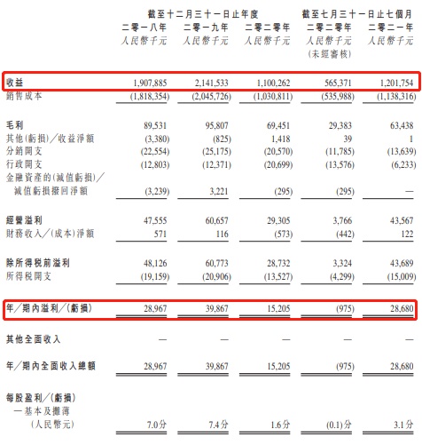 智通财经APP观察到,金泰丰2018至2020三个年度以及去年和今年前七个月,收入分别为19.08亿、21.42亿、11.00亿、5.65亿以及12.02亿人民币。截至2020年三个年度年/期内分别溢利2896.7万、3986.7万、1520.5万人民币,去年前七个月录得97.5万亏损,但今年同期扭亏为盈,实现2868万的溢利。