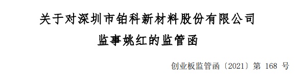 智通财经APP获悉,11月2日,深交所向深圳市铂科新材料股份有限公司(铂科新材,300811.SZ)监事姚红发出监管函。监管函指出,铂科新材于2021年10月27日披露《2021 年三季度报告》,姚红作为铂科新材监事,其配偶江军在铂科新材定期报告披露前三十日内买入铂科新材股票行为,构成敏感期交易。
