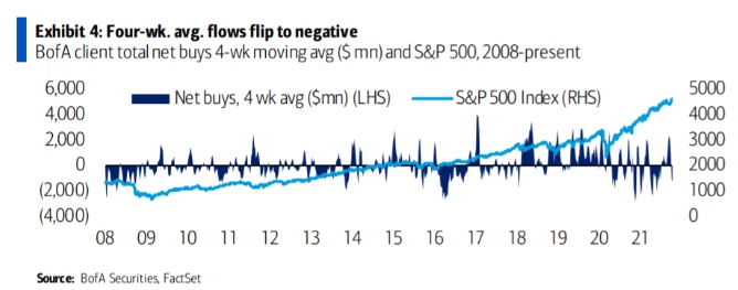 调查显示,尽管标普500指数连续第四周上涨,但美国银行的客户均为净卖家,流出16亿美元,连续第五周出现资金流出,四周平均流量为负值。