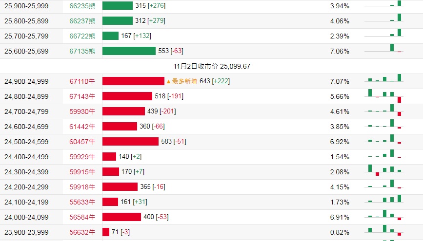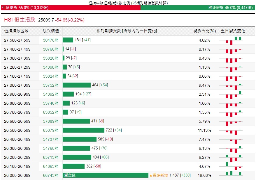 法兴恒指牛熊证街货分布图中的数据显示,熊证街货重货区在26,000-26,099区间,该区间最新熊证数量为1487张,较上一交易日增加330张;最多新增在相同区间。