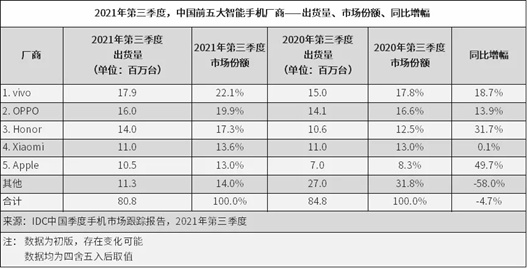 智通财经APP获悉,根据最新国际数据公司(IDC)手机季度跟踪报告,2021年第三季度,中国智能手机市场出货量约8,080万台,同比下降4.7%。平均单价的持续上涨,及产品创新力不足以刺激消费者换机周期缩短成为市场持续走低的主要因素。相比于上半年,头部厂商的份额差距继续拉近,前五大厂商市场份额均已超过两位数。