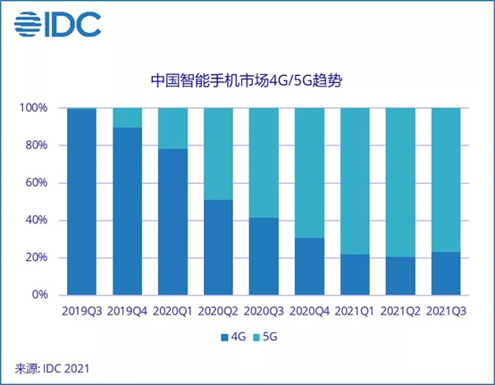 近日,随着中国市场5G正式迈入商用两周年,5G终端也已经完全成为国内市场主流。2021年第三季度,5G智能手机占整体市场出货量的77.0%,但值得一提的是,本季度国内4G智能手机的出货量占比在近两年以来首次出现反弹。究其原因,一方面来自于华为在不可抗力的影响下,不得已大幅转向4G产品;但另一方面,其他头部厂商入门级4G产品,市场需求依旧展现出了明确的持续性,包括在下半年内仍然有若干4G新品在国内市场面市。