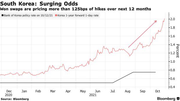 韩国掉期合约显示,未来12个月将升息约125个基点,高于10月初的69个基点。