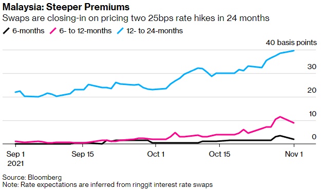马来西亚掉期合约显示,未来12-24个月将升息约40个基点,高于10月初时的23个基点。