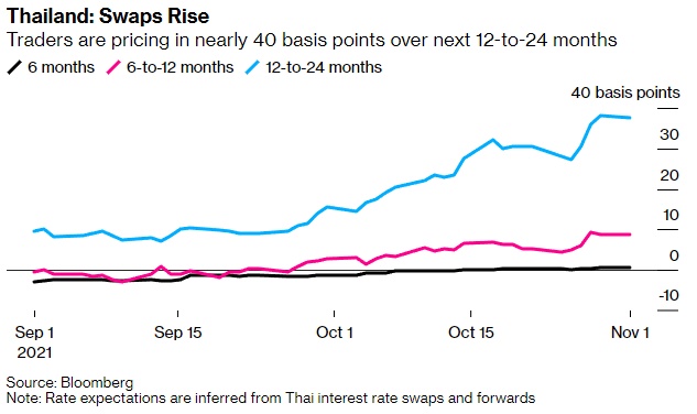 泰国掉期合约显示,未来12-24个月将加息约40个基点,高于10月初的约15个基点。