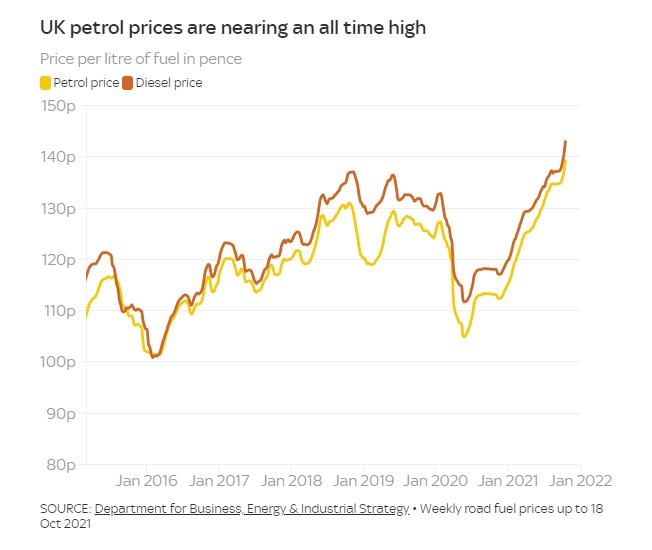 RAC发言人Simon Williams表示:“2021年10月,汽油和柴油价格都创下了新高,对司机来说是可怕的一个月。零售商现在每升汽油的利润率比疫情前更高,这人为地推高了汽油的价格。”
