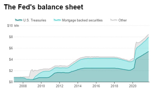 而因为去年新冠疫情爆发后,美联储为保住经济,将联邦基金利率降至接近于零的水平,并推出一系列措施,包括每月购买政府支持的债券,美联储当前的资产负债表已扩张至8.6万亿美元,市场预计本次taper将于2021年11月开始。