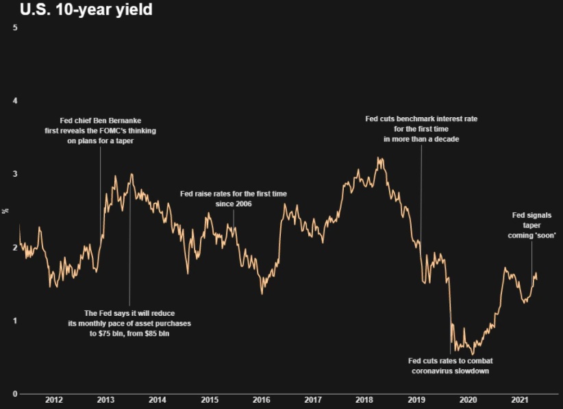 2013年,时任美联储主席伯南克(Ben Bernanke)在国会作证时暗示美联储正在考虑退出货币支持计划后,美国国债收益率飙升。