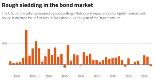 这一次,鲍威尔试图提前让市场做好开始缩减购债规模的准备。不过,由于部分投资者押注美联储需要比预期更加强硬才能对抗通胀,美国债券市场近几周来经历了大幅波动。与此同时,经济增长反弹的预期推高了收益率,使美国债券市场可能迎来2013年以来最糟糕的一年。
