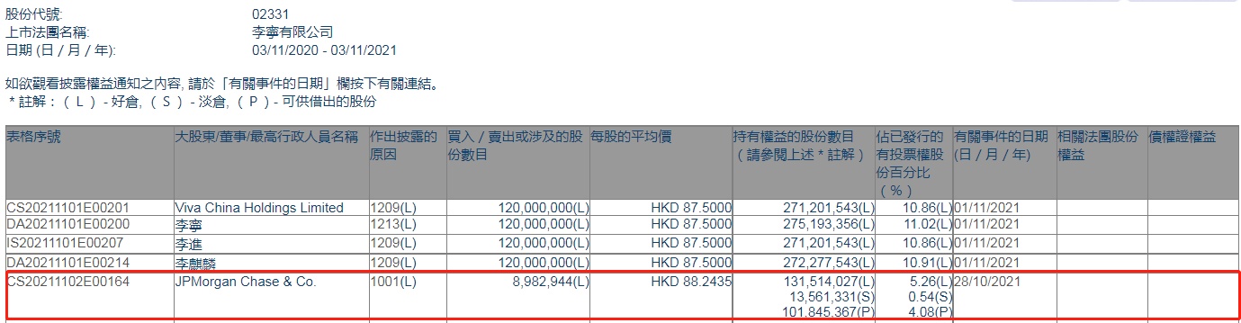 智通财经APP获悉,香港联交所最新资料显示,10月28日,小摩增持李宁(02331)约898.29万股,每股作价88.2435港元,总金额为约7.93亿港元。增持后最新持股数目约为1.32亿股,最新持股比例为5.26%。