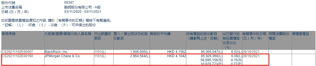 智通财经APP获悉,香港联交所最新资料显示,10月28日,小摩增持鞍钢股份(00347)296.4584万股,每股作价4.1042港元,总金额约为1216.72万港元。增持后最新持股数目约为8592.61万股,最新持股比例为6.08%。