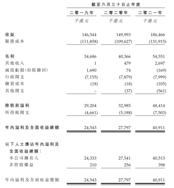 从财务数据来看,于2019-2021财年(截至6月30日止),公司的收益分别约为1.47亿港元、1.50亿港元及1.86亿港元。期内,纯利分别约为2450万港元、2780万港元及4090万港元,毛利率亦由23.7%增长至29.3%,呈现相对稳定的增长趋势。