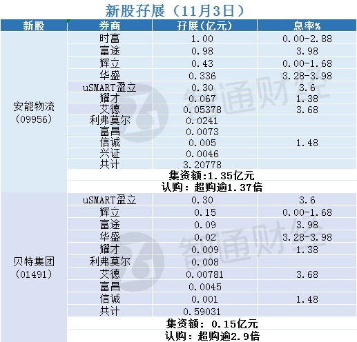 智通财经APP获悉,安能物流(09956)和贝特集团(01491)正在招股中。截至11月3日,uSMART盈立、富途、耀才、辉立、华盛、富昌等合计分别为其借出孖展3.20778亿港元及0.59031亿港元。其中,安能物流超购逾1.37倍,贝特集团超购逾2.9倍。