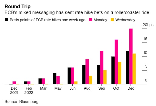 在澳洲联储本周发表鸽派言论后,货币市场对欧洲央行在2022年12月前加息的押注有所缓和。不过,尽管拉加德发表了上述言论,市场对欧洲央行的加息预期仍保持在10个基点,低于周一的23个基点。