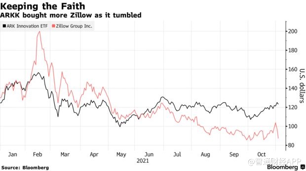 而“木头姐”凯西·伍德旗下的Ark Innovation ETF(ARKK.US)昨日便出手增持了Zillow公司的股票。该ETF在周二买入了Zillow公司288813股。除了ARKK外,伍德旗下的其他ETF也持有Zillow。截至昨日,Ark总共拥有约710万股Zillow股票,价值约为4.658亿美元,Ark为Zillow的第五大股东。