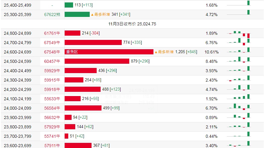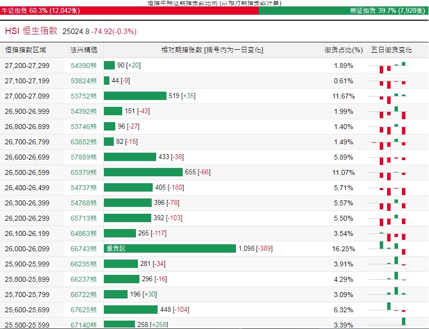 法兴恒指牛熊证街货分布图中的数据显示,熊证街货重货区在26,000-26,099区间,该区间最新熊证数量为1098张,较上一交易日减少389张;最多新增在25,300-25,399区间,该区间最新熊证数量为341张,较上一交易日增加341张。