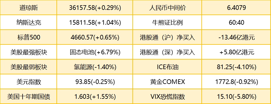 1. 隔夜美股截至收盘,道指涨104.95点或0.29%,报36157.58点;纳指涨161.98点或1.04%,报15811.58点;标普500指数涨29.92点或0.65%,报4660.57点。港股ADR指数上涨,按比例计算,收报25113点,涨88.58点或0.35%。
