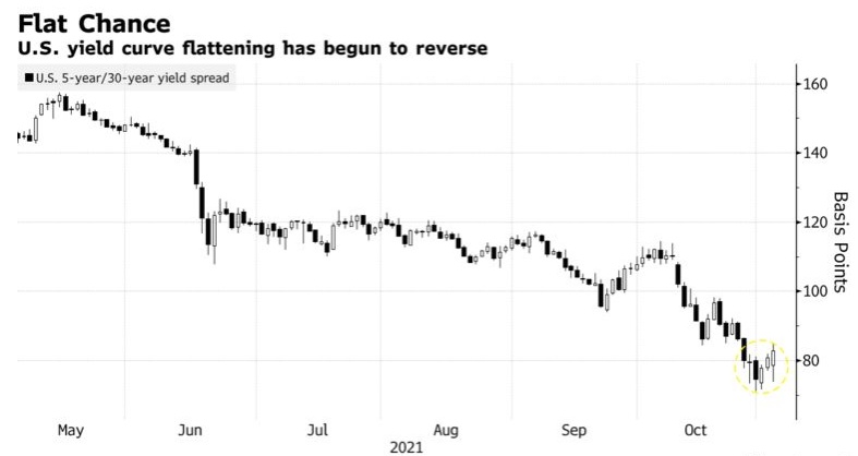 道明证券策略师Jim O 'Sullivan表示:“国债收益率和收益率曲线应仍处于国债标售规模缩减、量化宽松缩减、未来几周可能出台的财政方案以及市场对前段国债的重新定价之间。这应该会使波动性保持在高位,但随着投资者消化taper和加息周期开始带来的流动效应,利率将面临一些上行压力。在净久期供应充足的情况下,taper应该会使曲线变陡,但加息周期的任何进一步推动都应该会使曲线变平。鉴于市场对2022年7月首次加息和2022年两次以上加息的积极定价,我们仍看涨前端利率。”