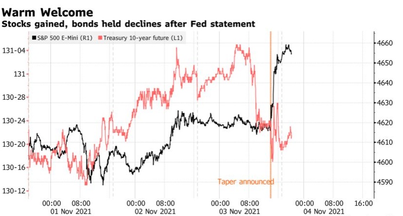 周四凌晨,鲍威尔宣布开始减少债券购买,但表示美联储可以耐心地等待提高利率。美股收于高位,美国国债回落,收益率曲线温和趋陡,扭转近期趋平趋势。