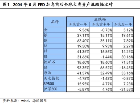 2004年6月FED启动加息,在加息前一年,各类资产价格的涨跌幅(取整数)分别为黄金9%、银37%、铜63%、铝19%、锌41%、镍31%、铁矿石18%、锡93%、原油41%、美元指数-4%、SP500(16%)、沪深300(-5%)。加息前一年,工业品表现强势,并未受到缩紧“银根”的预期影响。