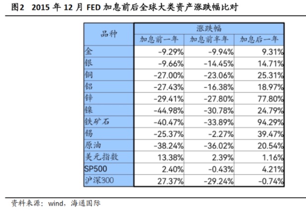 2015年12月FED启动加息,在加息前一年,各类资产价格的涨跌幅(取整数)分别为黄金-9%、银-9%、铜-27%、铝-27%、锌-29%、镍-45%、铁矿石-40%、锡-25%、原油-38%、美元指数13%、SP500(2%)、沪深300(27%)。加息前一年,工业品表现惨淡。