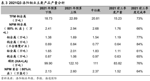 洛阳钼业2021前三季度各产品产量占全年预算中位数的比重,目前除铜、钴、铌等品种已经超过年度计划的75%。我们认为随着TFM 10K项目在Q4继续释放铜钴产能,公司Q4季度产量将高于前三季度均值,顺利完成全年预算指标。