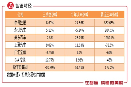 实际上,每个行业都有投资机会,无论是成熟性的还是成长性的行业,都会有基本面非常好的公司,龙头受资金青睐。以港股汽车经销商为例,龙头中升控股(00881)为趋势性牛股,美东汽车(01268)因高成长性成为三年来涨幅最靓的仔,但也有部分长期跌幅较大的个股,比如正通汽车及广汇宝信,三年来跌幅分别为78.3%和62%。