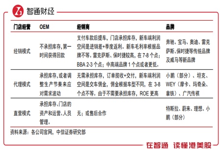 行业门店经营模式主要分为三种,分别为经销模式,这种模式比较成熟,基本港股的汽车经销商都采用这种模式;代理模式,在这种模式下,经销商不需要承担库存,成本掌控强,目前主要为新能源品牌采用的模式;直营模式,最代表性的为特斯拉及蔚来,自产自销,没有经销商环节,但耗费成本较大。