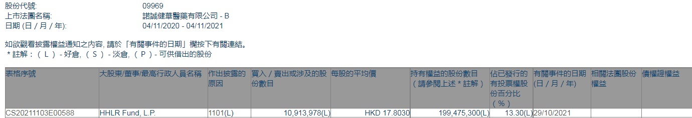 智通财经APP获悉,香港联交所最新资料显示,10月29日,高瓴资本增持诺诚健华-B(09969)约1091.4万股,每股作价17.803港元,总金额约为1.94亿港元。增持后最新持股数目约为1.99亿股,最新持股比例为13.3%。