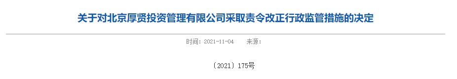 北京证监局提出:北京厚贤投资管理有限公司应在收到本决定之日起30日内向我局提交书面整改报告,我局将择机对你公司的整改落实情况组织检查验收。