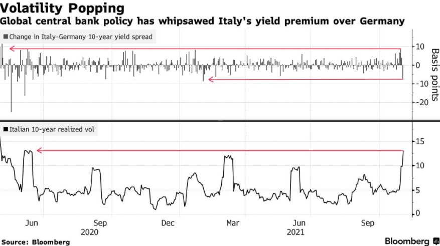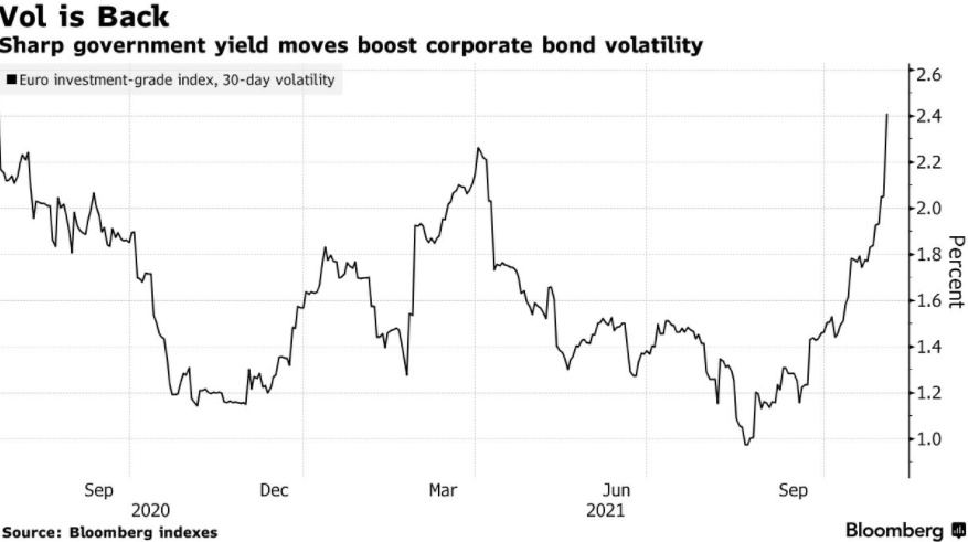 智通财经APP注意到,欧洲债券交易员和欧洲央行之间的僵局引发了债券市场的动荡。欧元投资级债券、垃圾债券和意大利债券的波动率指标均升至数月高位。