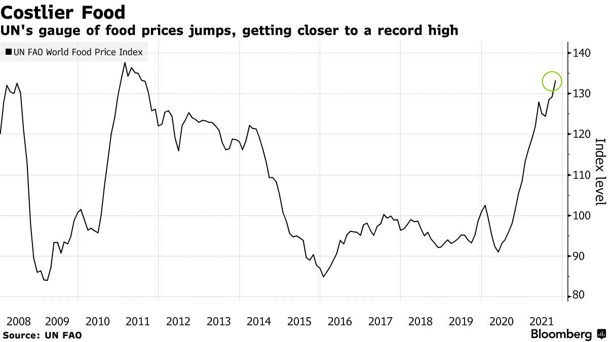 智通财经APP了解到,联合国公布的一项跟踪从小麦到植物油等主要食品的指数在10月份攀升3%,创下近10年来新高,已十分接近2011年历史最高水平。而这可能会进一步推高自新冠疫情以来处于高位的家庭食品类支出,还有可能加剧各国央行对通胀的担忧,并且可能加剧处于多年来最严重的全球饥饿状况。