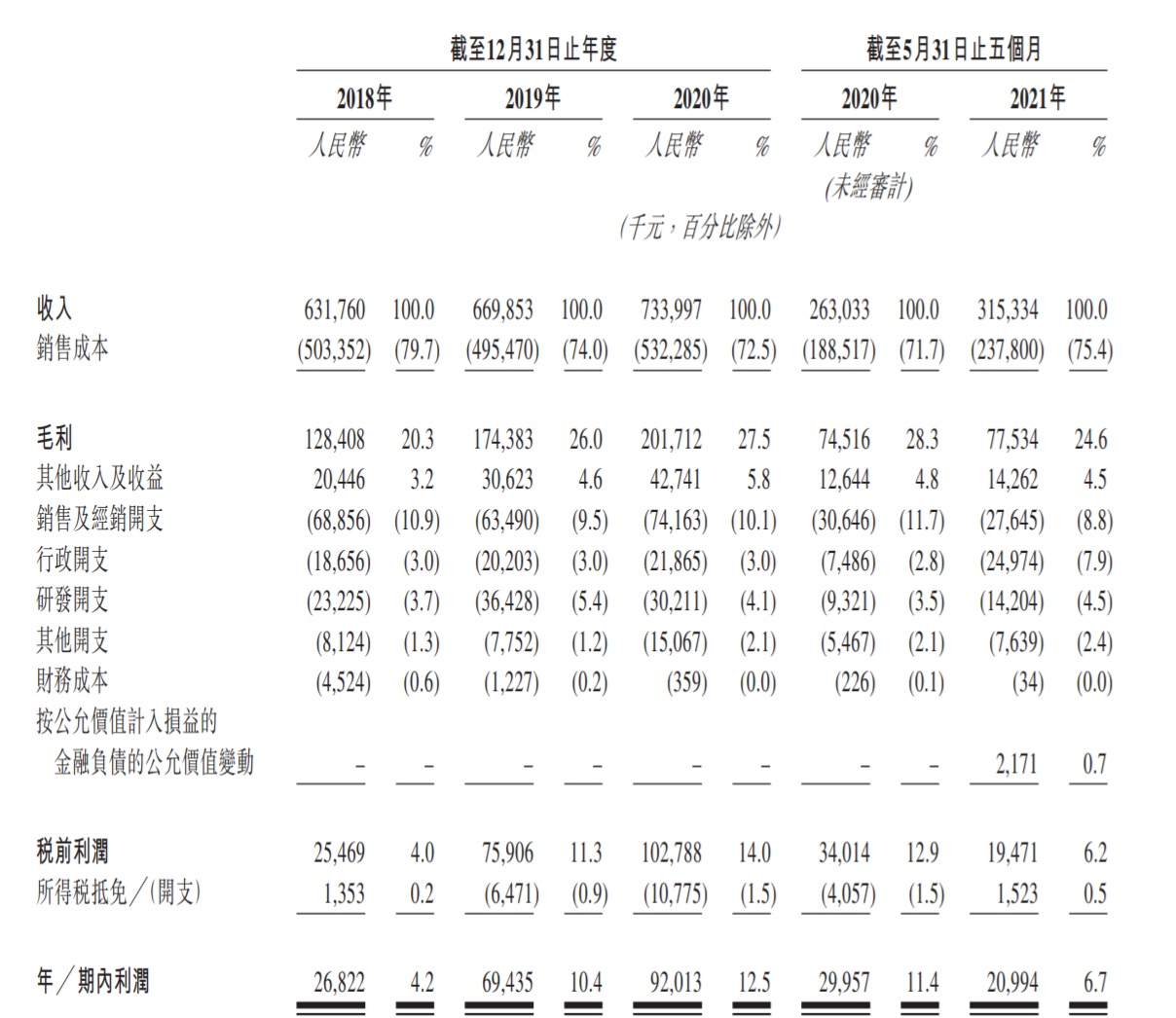 于截至2018年12月31日、2019年12月31日、2020年12月31日止年度,公司的收入分别为6.317亿元人民币、6.698亿元人民币及7.339亿元人民币。同期,公司的期内利润分别为2682.2万元人民币、6943.5万元人民币及9201.3万元人民币。