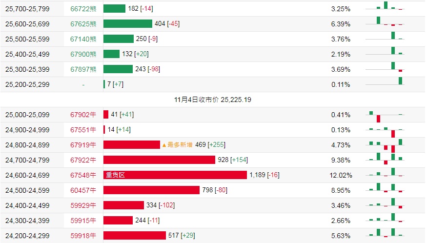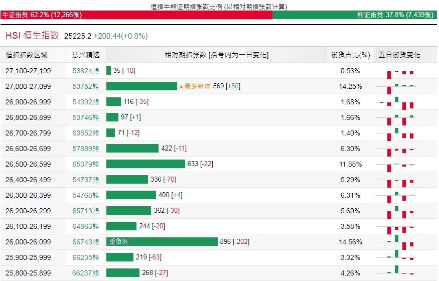法兴恒指牛熊证街货分布图中的数据显示,熊证街货重货区在26,000-26,099区间,该区间最新熊证数量为896张,较上一交易日减少202张;最多新增在27,000-27,099区间,该区间最新熊证数量为569张,较上一交易日增加50张。