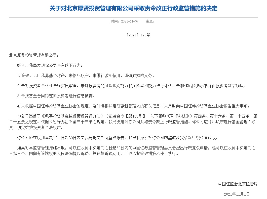智通财经APP获悉,据北京证监局11月4日消息,北京证监局对北京厚贤投资管理有限公司采取责令改正行政监管措施。经查,该公司存在以下行为:一、管理、运用私募基金财产,未恪尽职守,未履行诚实信用、谨慎勤勉的义务。二、未对投资者合格性进行实质审查;未对投资者的风险识别能力和风险承担能力进行评估;未制作风险揭示书并由投资者签字确认。三、未按基金合同约定向投资者进行信息披露。四、未根据中国证券投资基金业协会的规定,及时填报并定期更新管理人的有关信息;未及时向中国证券投资基金业协会报告重大事项。上述行为违反规定,北京证监局决定对该公司采取责令改正行政监管措施。