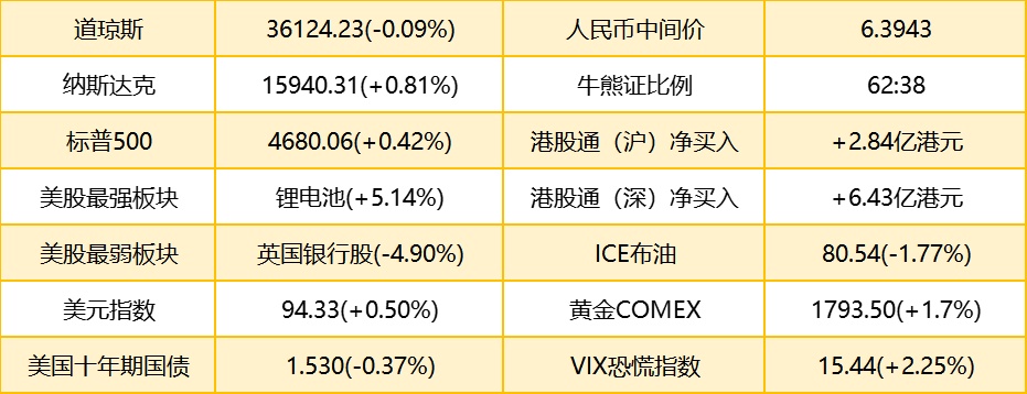 1. 隔夜美股截至收盘,道指跌33.35点或0.09%,报36124.23点;纳指涨128.72点或0.81%,报15940.31点;标普500指数涨19.49点或0.42%,报4680.06点。港股ADR指数下跌,按比例计算,收报24827点,跌398.31点或1.60%。