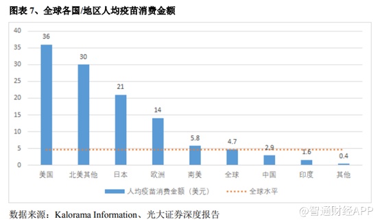 另外,由于中国疫苗起步时间晚,技术相对落后,国内疫苗接种意识相对较差,因此从人均疫苗消费金额来看,中国的人均疫苗消费金额仅2.9美元,而全球平均水平为4.7美元。可见,随着国内人均可支配收入的提升,疫苗接种意识的增强,以及国内外疫苗代际差异的缩小,中国疫苗市场具有较大的提升空间。因此对于国内的疫苗企业来说,只要抓住窗口发展期,便能享受不错的市场红利。