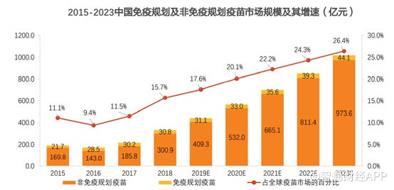 天风证券预计至2023年中国的非免疫规划疫苗市场规模将达到973.6亿元,占全球疫苗市场比例的26.4%。