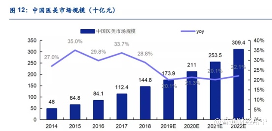近几年,中国医美市场快速增长。数据显示,近五年中国医美市场快速增长,年增速保持30%上下,2018年市场规模达1448亿元,5年CAGR达31.79%。并且根据东吴证券预测,未来几年都会保持20%以上增长,2022年市场空间将达到3094亿元。