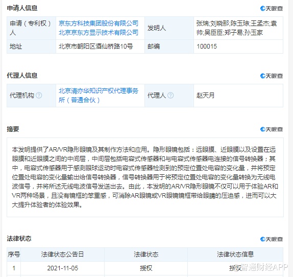 智通财经APP获悉,天眼查App显示,11月5日,京东方科技集团股份有限公司(000725.SZ)获得“AR/VR隐形眼镜及其制作方法和电子设备”专利授权,公告号CN109633910B,该专利申请于2019年1月,申请人还包括北京京东方显示技术有限公司。