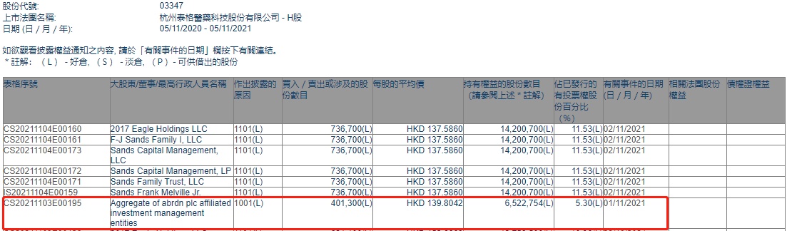 智通财经APP获悉,香港联交所最新资料显示,11月1日,Aggregate of abrdn plc affiliated investment management entities增持泰格医药(03347)40.13万股,每股作价139.8042港元,总金额约为5610.34万港元。增持后最新持股数目约为652.28万股,最新持股比例为5.30%。