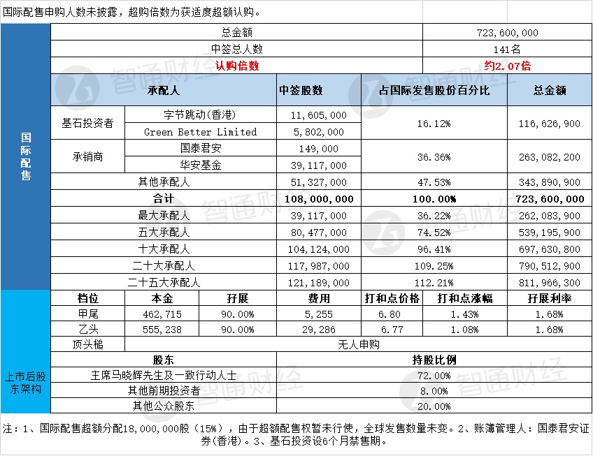 国际配售中签总人数未披露,认购倍数约2.07倍。