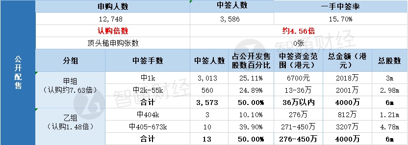 其中,公开配售申购人数12,748人,一手中签率15.70%,认购倍数约4.56倍。