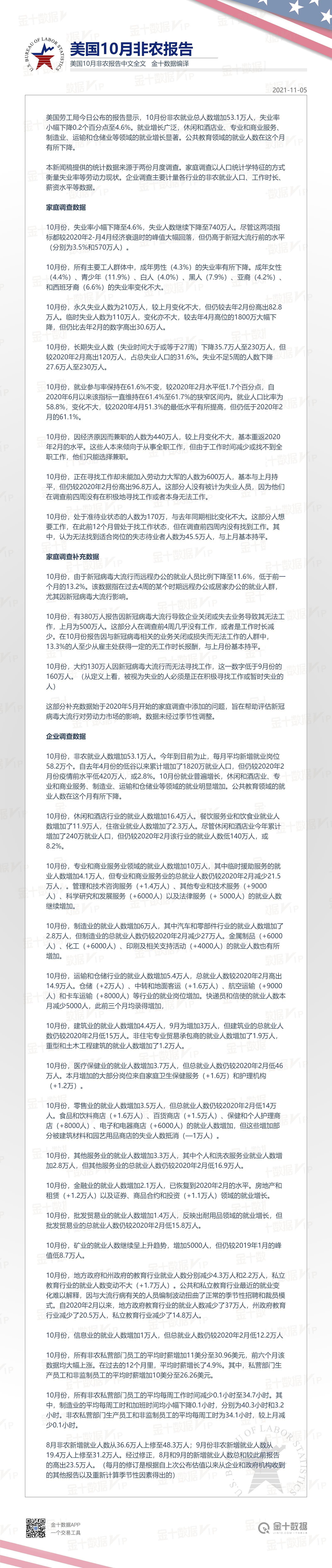 10月份非农就业总人数增加53.1万人,失业率小幅下降0.2个百分点至4.6%。就业普遍增长,休闲和酒店业、专业和商业服务、制造业、运输和仓储业等领域的就业增长显著。公共教育领域的就业人数在这个月有所下降。