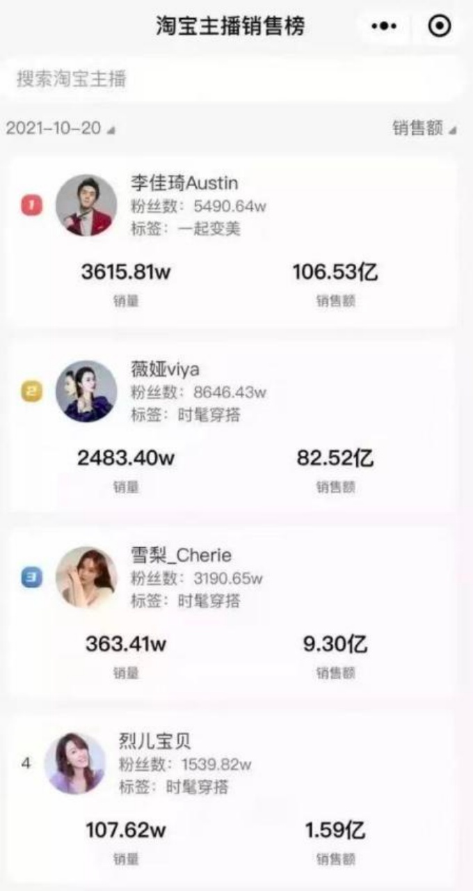 今年的双十一,最先引起广泛讨论的大概要数李佳琦和薇娅了。在10月20日即天猫本次双十一第一波预售开启日的当晚,据公开数据,李佳琦、薇娅直播间累计交易额分别达到106.53亿元、82.52亿元,销量分别高达3615.81万件、2483.4万件,顶流直播间的热度可见一斑。