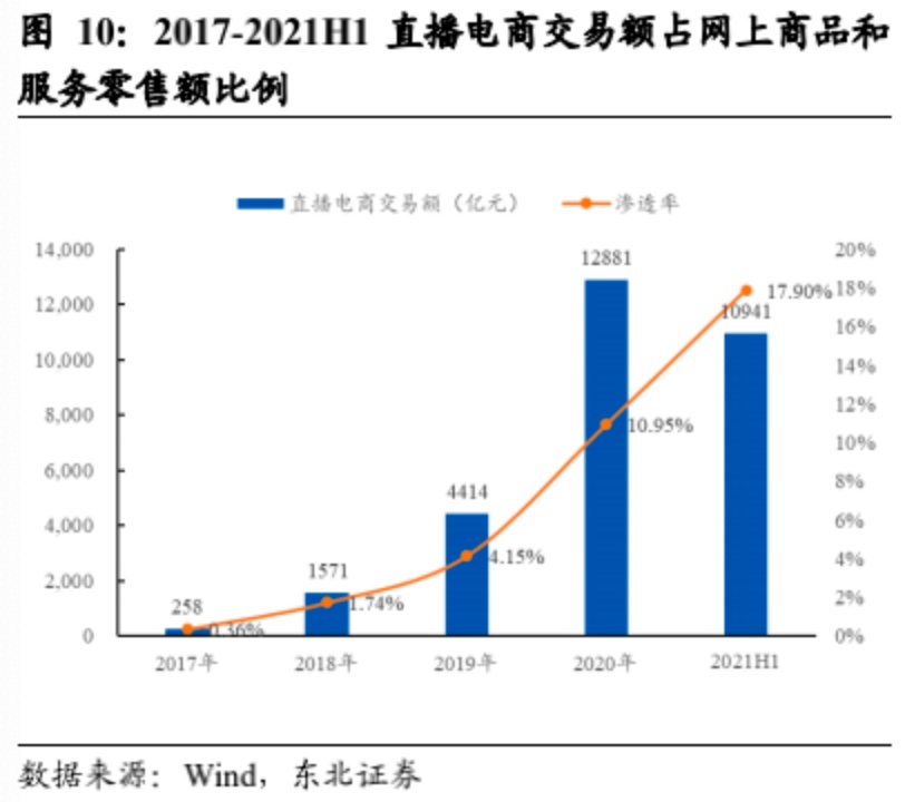 另一方面,直播电商近年来对于消费品零售的贡献度亦在逐年提升。数据显示,2021年上半年直播电商额占网上商品和服务零售额比例已达到17.9%,相较于2020年底的10.95%有显著提升。