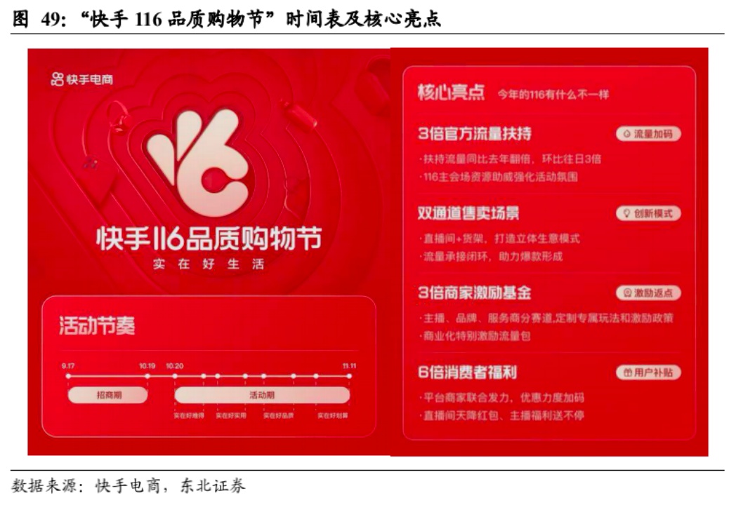 作为直播电商领域里的强有力竞争者,快手-W(01024)和抖音亦在加强其在双十一里的“存在感”。先来看快手,公司本次推出的116品质购物节分为9月-10月19日的“备战期”和10月20日-11月11日的“作战期”两个阶段。与往年不同的是,今年快手在大促期间拿出3倍流量扶持、3倍商家激励基金、6倍消费者购物福利以及千万服务商激励,并将尝试直播间加货架的双通道售卖场景,从而打造更立体的生意模式和购物体验。其中主播端,快手针对不同梯度的主播推出了“116超级主播挑战计划”、“116BigDay挑战计划”以及“主播排位赛”,对平台主播进行激励。